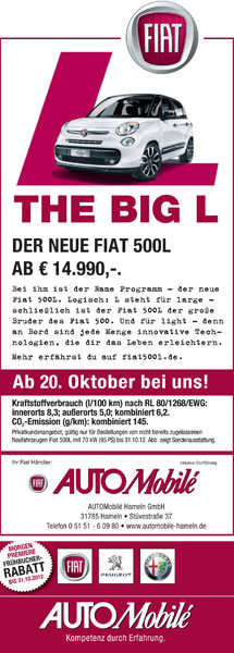 Feiern Sie mit uns am Samstag, den 20.10.2012, die Premiere des neuen Fiat 500L