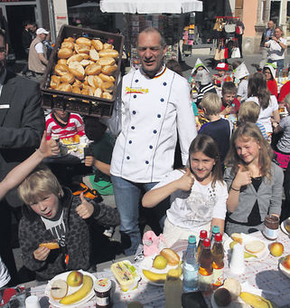 1250 Brötchen hat die unter seiner Ägide stehende Bäckerei Mensing gesponsert und unter fast 800 Schülerinnen und Schülern, die das Projekt „Zeitung in der Grundschule“ mit Ideen, Artikeln und Bildern mit Leben gefüllt haben, bei der Abschlussaktion an der Hochzeitshausterrasse verteilt.