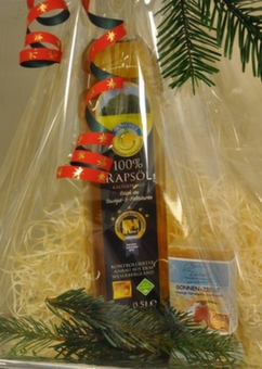 Das Bild zeigt Rapsöl von der Ottensteiner Ölmühle und die Naturseife „Sonnen-Ziege“ aus dem Solling, daß vor Weihnachten angeboten wurde: Ein Beispiel für originelle Geschenkideen mit „Echt!“-Prädikat und Bezug zur Solling-Vogler-Region.
