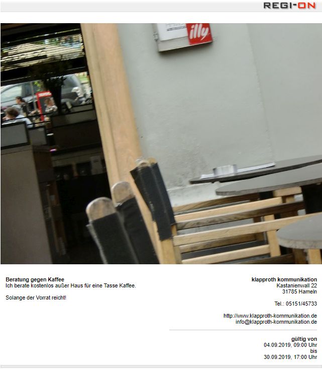 Eigentlich heißt die Aktion, die ich aktuell anbiete, Beratung gegen Kaffee - außer Haus! Dann wäre es definitiv nicht passiert.
