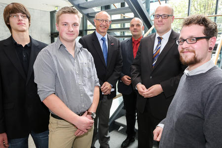 Das Photo zeigt von links nach rechts: Metallbauer FR Konstruktionstechnik Thorsten Barklage aus Emmerthal, Fliesen-Platten- und Mosaikleger Christian Meier aus Bad Pyrmont Handwerkskammerpräsident Karl-Wilhelm Steinmann, Metallbauermeister Torsten Schramm, Herrn Eggert und ganz rechts Bestattungsfachkraft Lennart Gülzow aus Bad Pyrmont.