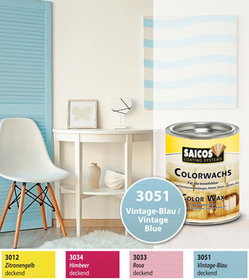 Das SAICOS Colorwachs, beliebt als Renovierungsanstrich für alte Möbelstücke, ist in insgesamt 4 neuen Farbtönen erhältlich. Neben Vintage-Blau, frischem Zitronengelb und fruchtigem Himbeer, lässt auch das zarte Rosa Platz für unzählige, kreative Gestaltungsmöglichkeiten.