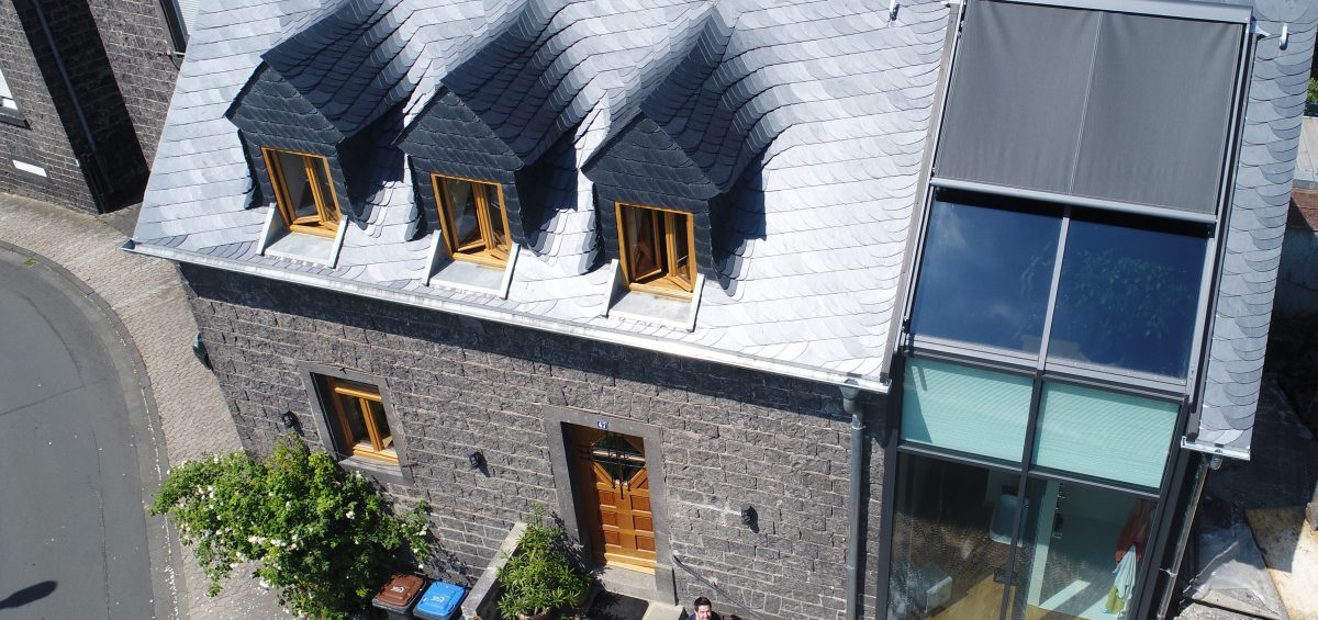 Auf dem Dach sorgt Naturschiefer von Rathscheck für einen besonders edlen Außenauftritt. Die Schuppendeckung vereint zeitlose Schönheit und klares Design mit enormer Langlebigkeit: 400 Millionen Jahre alter Schiefer, der im benachbarten Mayen noch aus den Tiefen der Eifel geholt wird, gilt als die haltbarste Dacheindeckung überhaupt. „Wir sind keine Ökos“ lacht Jan Ockenfels, wenn er aus der Gaube im Arbeitszimmer auf sein im Sonnenlicht seidig-schimmerndes Dach schaut, „aber wir haben unseren Fokus beim Umbau besonders auf werthaltige Materialien gelegt. Da gab es keine Alternativen zu Schiefer.“ Bei 70 Quadratmetern Dachfläche waren die Material-Mehrkosten gegenüber einer künstlich hergestellten Eindeckung eher sogar „erstaunlich günstig“. Insgesamt investierte der Bauherr in die Sanierung etwas mehr als 200 000 Euro, rund