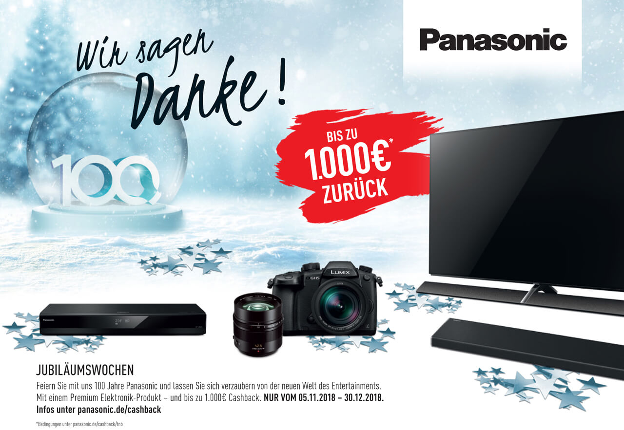 Hamburg, November 2018 – „Wir sagen Danke“ ist das Motto der Cashback-Kampagne, mit der Panasonic ab dem 5. November 2018 das Weihnachtsgeschäft einläutet. Die Aktion umfasst 4K Ultra HD TVs, UHD Blu-ray Recorder und -Player, Soundbar Systeme, LUMIX Wechselobjektivkameras sowie LEICA DG Objektive.