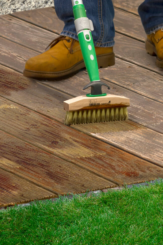 Damit die Oase im Grünen auch wirklich zum Lieblingsort avanciert, sind eine attraktive Gestaltung und eine gepflegte Optik unerlässlich. Mit dem Anstrich-Entferner Gel von Osmo werden die Holzterrassendielen optimal auf einen neuen Look vorbereitet. (Foto: Osmo)