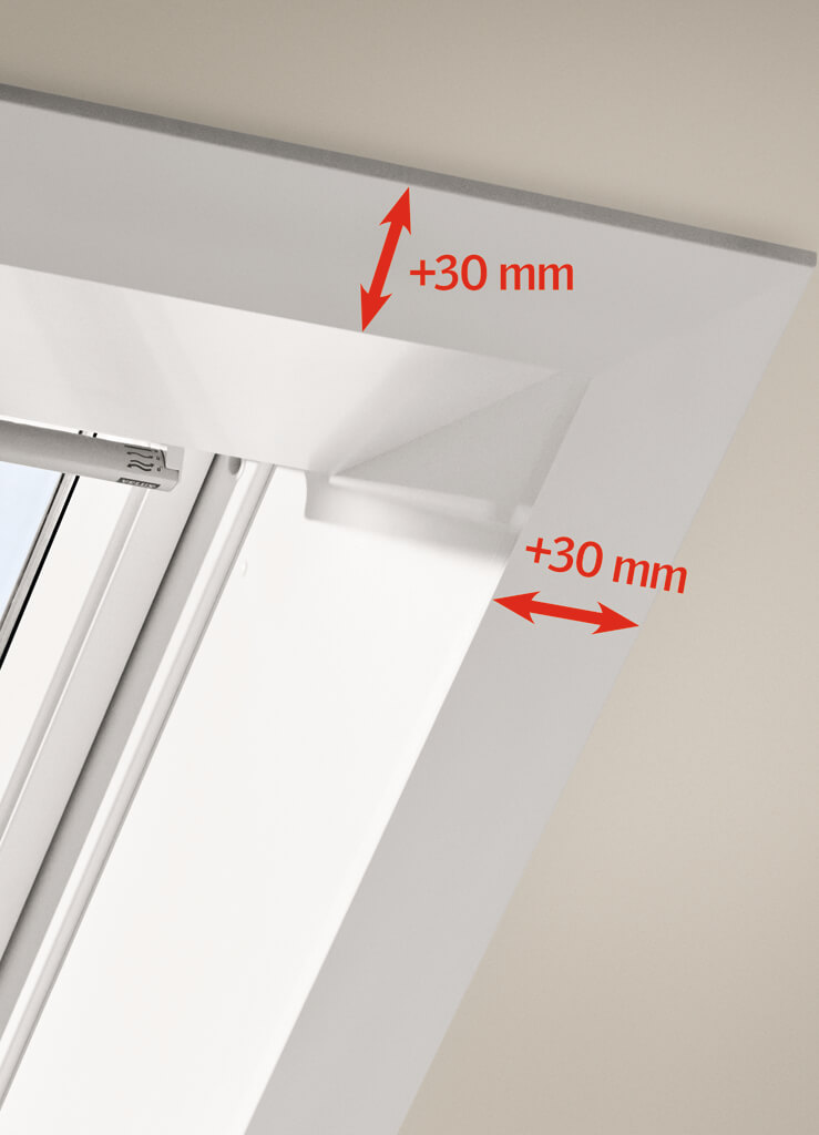 Das Renovierungskit für Velux Innenfutter enthält breitere Abdeckleisten, die beispielweise das Abdecken von vergrößerten Dachausschnitten beim Fensteraustausch erleichtern.