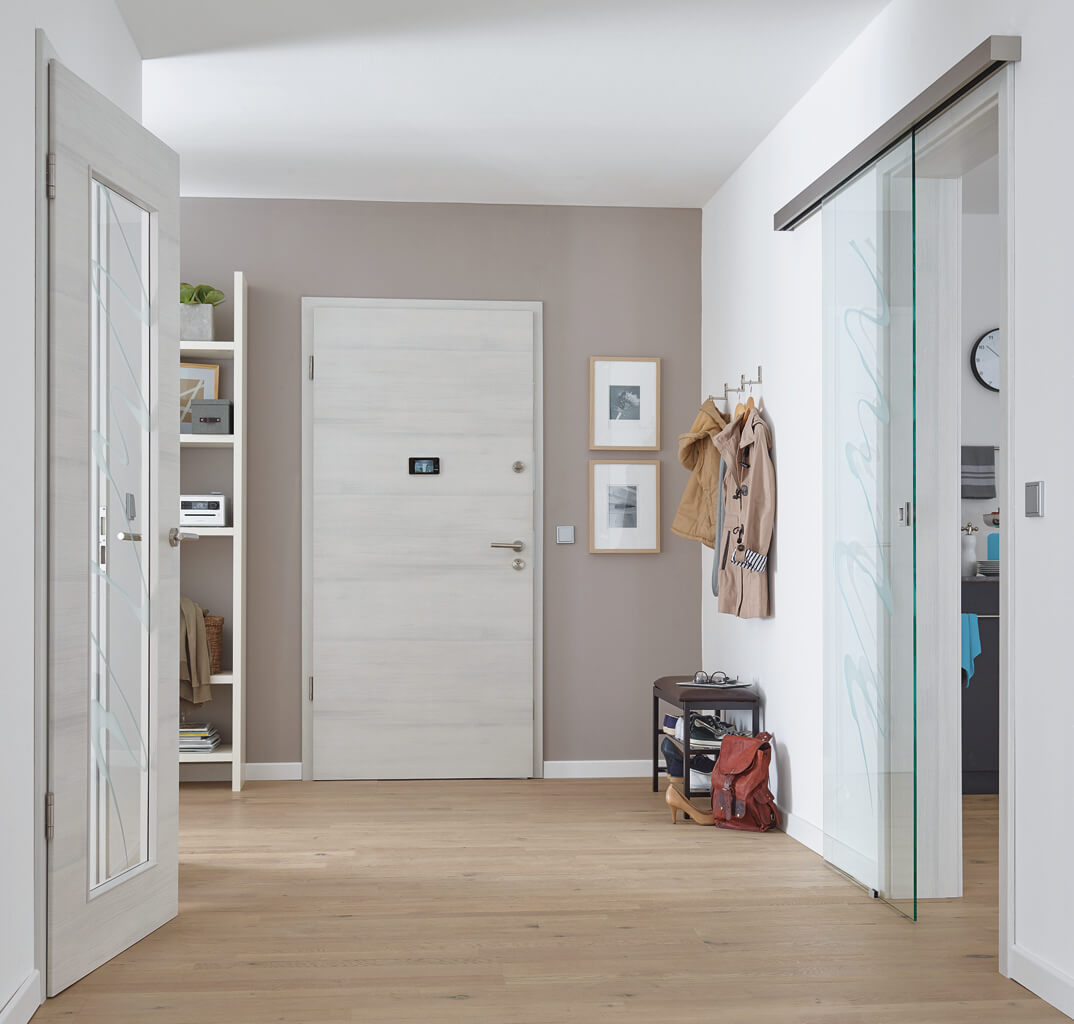 Einbruchhemmende Wohnungseingangstüren von PRÜM sorgen mit einer Massivholzverstärkung im Türblatt für eine erhöhte Widerstandsfähigkeit gegen ein gewaltsames Eindringen. Der Vorteil ist, dass ein massiver Türblattaufbau dem Einbrecher die Zeit nimmt, am Objekt über längere Zeit unentdeckt aktiv zu werden. Ein weiterer wichtiger Faktor beim Thema Sicherheit ist das Türschloss. Hier bieten spezielle Schutzbeschläge und hochwertige Schließsysteme eine ausgereifte Technik gegen ein Aufbohren oder Aushebeln. Für ein zusätzliches Maß an Sicherheit sorgt zudem eine Drei- bzw. Mehrfachverriegelung. Die Tür wird durch das Umdrehen des Schlüssels an drei oder mehreren Punkten gleichzeitig gesichert. Um ungebetene Gäste daran zu hindern, die Wohnung direkt zu betreten, bietet sich eine Türspaltsicherung an. Schließen und Entriegeln erfolgen über einen Drehknauf im Innenbereich. Mit dieser eleganteren Variante zur Türkette lässt sich die Tür nur einen Spalt breit öffnen. Einen weiteren erheblichen Komfortgewinn ermöglicht ein digitaler Türspion. Ist es nicht viel sicherer, schon vorher zu wissen wer vor der Tür steht, ohne diese öffnen zu müssen? Per einfachem Knopfdruck, zeigt das große Display des digitalen Türspions ein gestochen scharfes Bild vom Eingangsbereich und ermöglicht auch bei eingeschränkter Sehfähigkeit des Benutzers ein problemloses Identifizieren von Personen. Nach all diesen Vorgaben entwickelt PRÜM einbruchhemmende Funktionstüren. Zudem steht eine große Auswahl an Oberflächen zur Verfügung. Sich Zuhause sicher fühlen, macht heutzutage Wohn- und Lebensqualität aus.