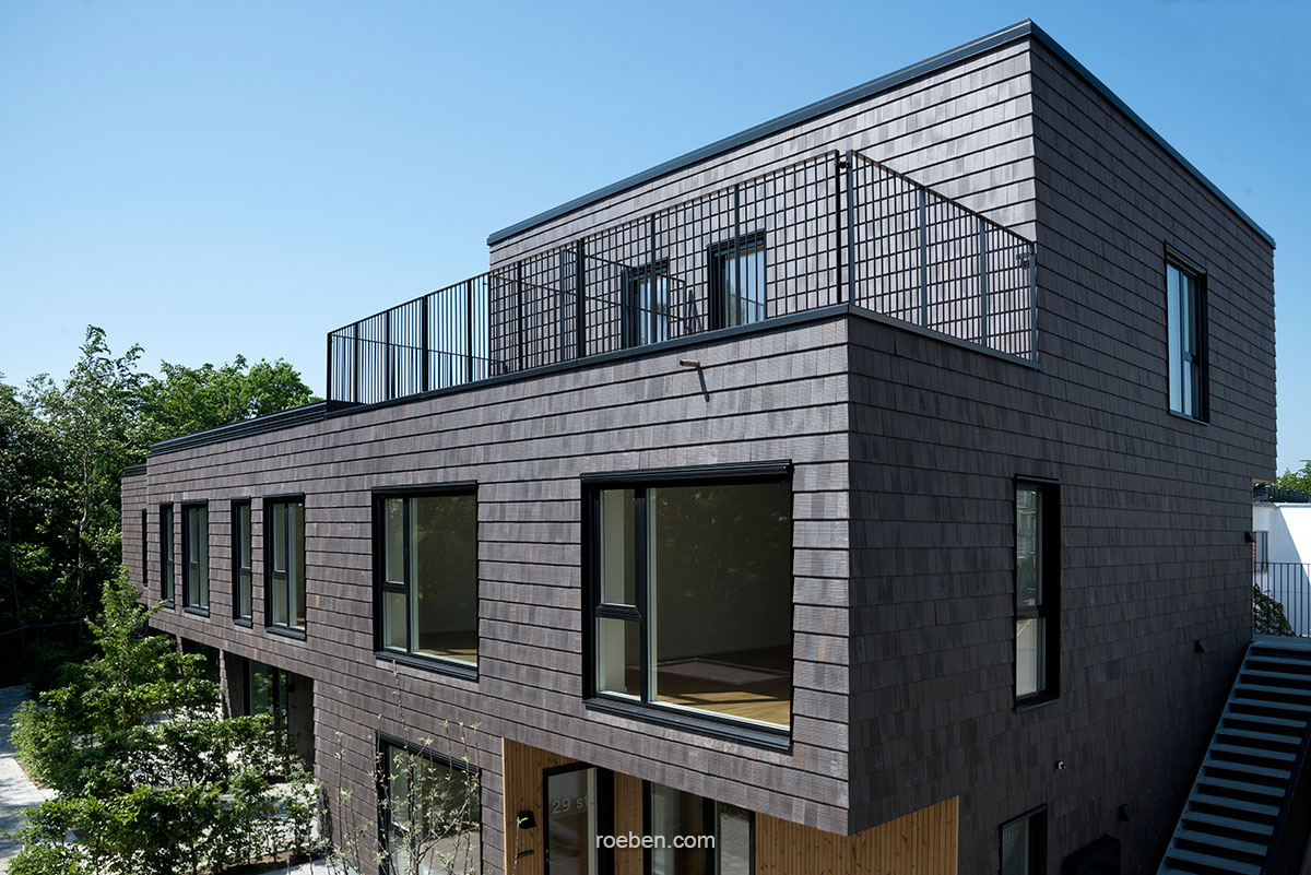 Die keramische Fassade betont den innovativen Charakter der Architektur und ermöglichen je nach Tageszeit und Lichteinfall völlig unterschiedliche Ansichten, die durch die horizontal gerillte Oberfläche der Riemchen zusätzlichen Reiz erhalten: „Die Riemchen werden aus einem der besten Tone weltweit gebrannt“, erklärt Niels Heidtmann. „Der Brand bei extrem hohen Temperaturen um 1.200 Grad Celsius erzeugt so eine wunderbare Farbenvielfalt in unterschiedlichen Nuancen.“ Im Zusammenspiel z.B. mit Holzterrassen und einzelnen Fassadenabschnitten aus Holz oder in Kombination mit Glas und Stahl ist so ein ebenso wertiges wie abwechslungsreiches Fassadenbild mit natürlicher Anmutung möglich.