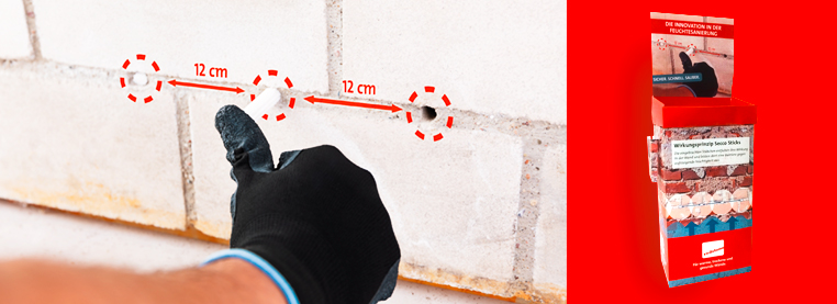 Für alle mineralischen Baustoffe geeignet sind die Secco Horizontalsperren-Sticks, nur Porenbeton ist hiervon ausgenommen. Die Sticks bilden eine wirkungsvolle, nachträgliche Sperre gegen aufsteigende Feuchtigkeit. Die Anwendung ist einfach und unkompliziert, aufwendige Geräte sind dazu ebenso wenig nötig wie fundiertes technisches Know-how.javascript:;