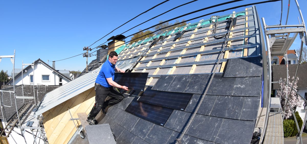 Rund 30 Paneele, die passgenau zwischen den nur 5 Millimeter starken rechteckigen Schiefersteinen in einem Schienensystem fixiert werden, können bereits ein Einfamilienhaus mit Sonnenstrom versorgen. Der Clou: Steigt der Strombedarf, werden im vorhandenen Rastersystem flexibel, einfach und schnell zusätzliche Stromerzeuger ergänzt.