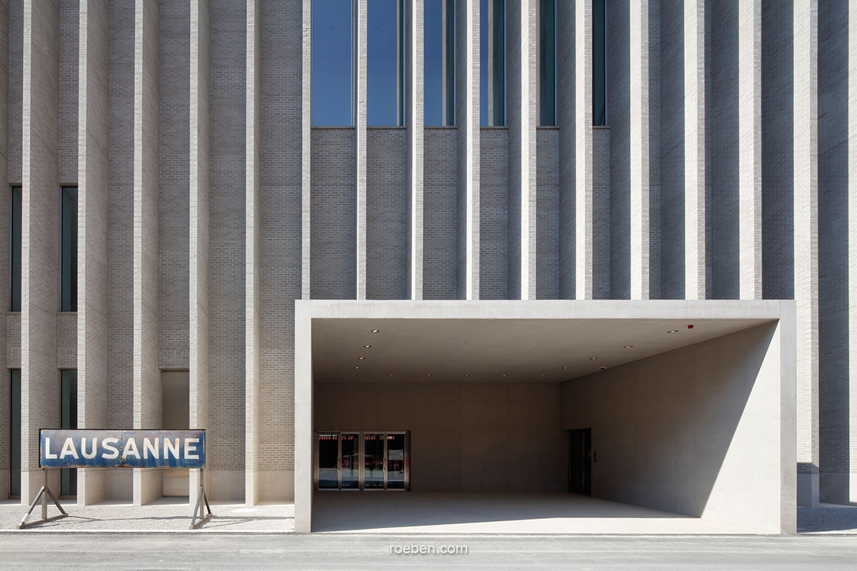 Ebendiese bauliche Verbindung findet sich auch beim Kunstmuseum in Lausanne, wo Ziegel-Fertigteilelemente den umlaufenden Mauerwerksverband ergänzen. Ein Kernpunkt, der den Architekten besonders am Herzen lag, war eine möglichst homogene, fugenlose Fassadenansicht. Hier stand vor allem das Fugenbild in den Anschlussbereichen zwischen Außenwandfläche und Pilastervorsprüngen im Vordergrund. In der Planung ließ sich dies über ein Einschieben der Pilaster lösen. Die Klinker auf den etwa 1,50 Meter breiten Zwischenwandflächen bewegten sich damit außerhalb der üblichen Baurichtmaße eines Mauerwerks und mussten speziell eingepasst werden. Horizontale Dehnungsfugen zwischen den einzelnen Fertigteilelementen erübrigten sich durch den großen Druck, den die Teile aufeinander ausüben.