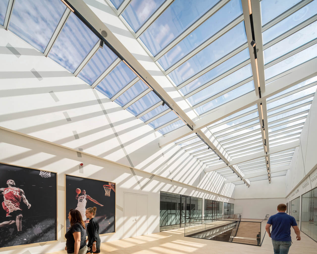 Miteinander verbundene Lichtband-Reihen bilden ein großes Glasdach