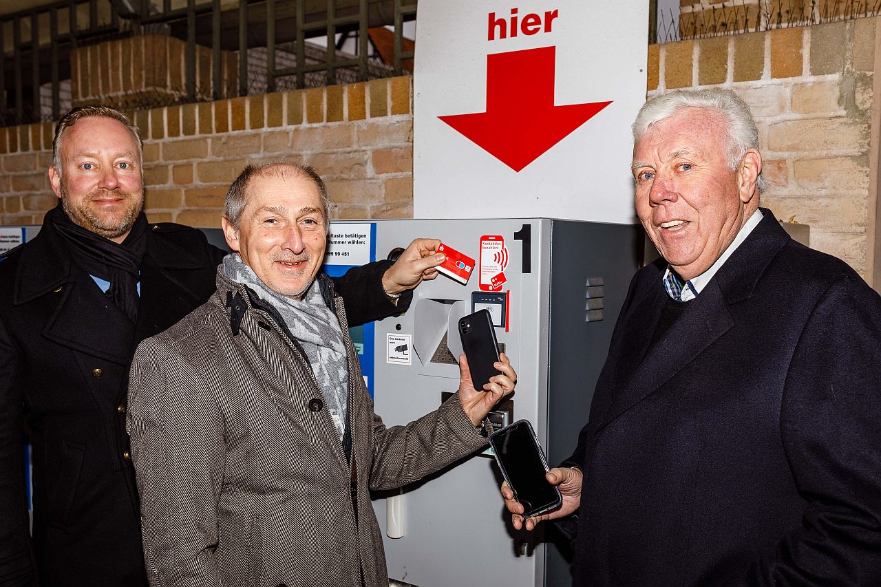 Bildunterschrift: (v.l.) Mathias-Friedrich Othmer, Alois Drube, Vorstandsvorsitzender der Sparkasse Hameln-Weserbergland, und Klaus-Peter Othmer nutzen schon das kontaktlose Bezahlen.