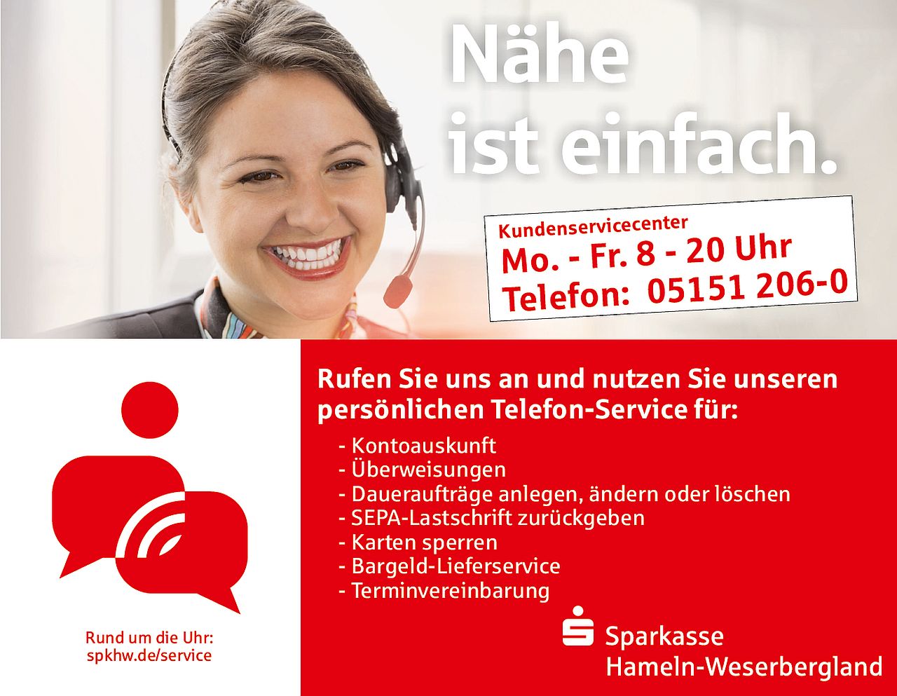Die Sparkasse Hameln-Weserbergland bietet mit dem Kundenservicecenter eine bequeme und sichere Alternative zum Filialbesuch an. Gerade in dieser schwierigen Corona-Zeit lässt sich so der persönliche Kontakt zum eigenen Schutz und dem der Sparkassen-Mitarbeiter (innen) vermeiden.